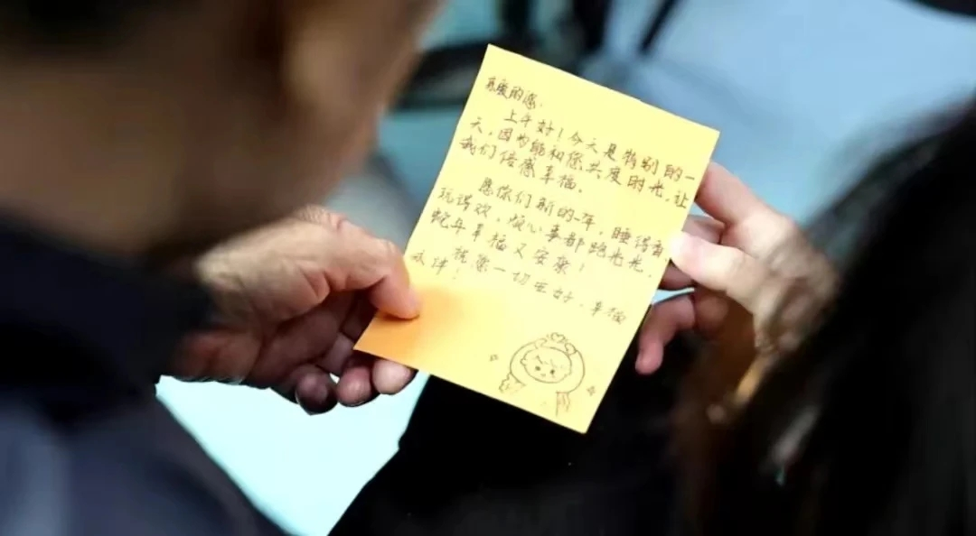 活動當(dāng)天,志愿者們早早來到養(yǎng)老院,現(xiàn)場洋溢著濃濃的節(jié)日氛圍。志愿者們不僅帶來精心準(zhǔn)備的節(jié)目,還與老人們交談,耐心傾聽他們的過往故事。距離表演開始還有一段時間,考慮到部分老人行動不便,志愿者們主動來到電梯口等待老人,將他們推往表演現(xiàn)場,老人們滿是期待,時不時和志愿者嘮嘮嗑,現(xiàn)場一片其樂融融。很快,精彩的節(jié)目正式開始,舞蹈志愿者們身著絢麗的服裝,用靈動的舞姿為老人們帶來了一場視覺盛宴;擅長唱歌的志愿者們一亮嗓,悠揚的歌聲便回蕩在養(yǎng)老院的每一個角落;志愿者們還為老人們帶來了有趣的手指操,在場的老人都很感興趣,老人們學(xué)得十分認(rèn)真,盡管有些動作不太標(biāo)準(zhǔn),但每個人都全情投入,臉上掛著專注又開心的笑容。表演結(jié)束,志愿者們端上熱氣騰騰的福粥送到老人的手中。對于一些身體不便的老人,志愿者們便親自喂粥。與此同時,志愿者們拿出精心準(zhǔn)備的賀卡遞到老人手中。賀卡上,繪著溫馨的圖案,寫滿了真摯的祝福,每一筆每一劃都飽含著對老人的敬愛。
