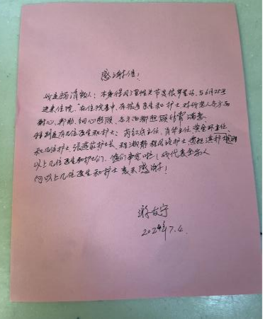 近日,護理學院22護理315班黃鈺淇同學,在福建醫(yī)科大學附屬第一醫(yī)院43區(qū)綜合病區(qū)實習期間,收到了住院患者親筆書寫的感謝信。護理部及科室護士長也對該同學給予高度贊揚。