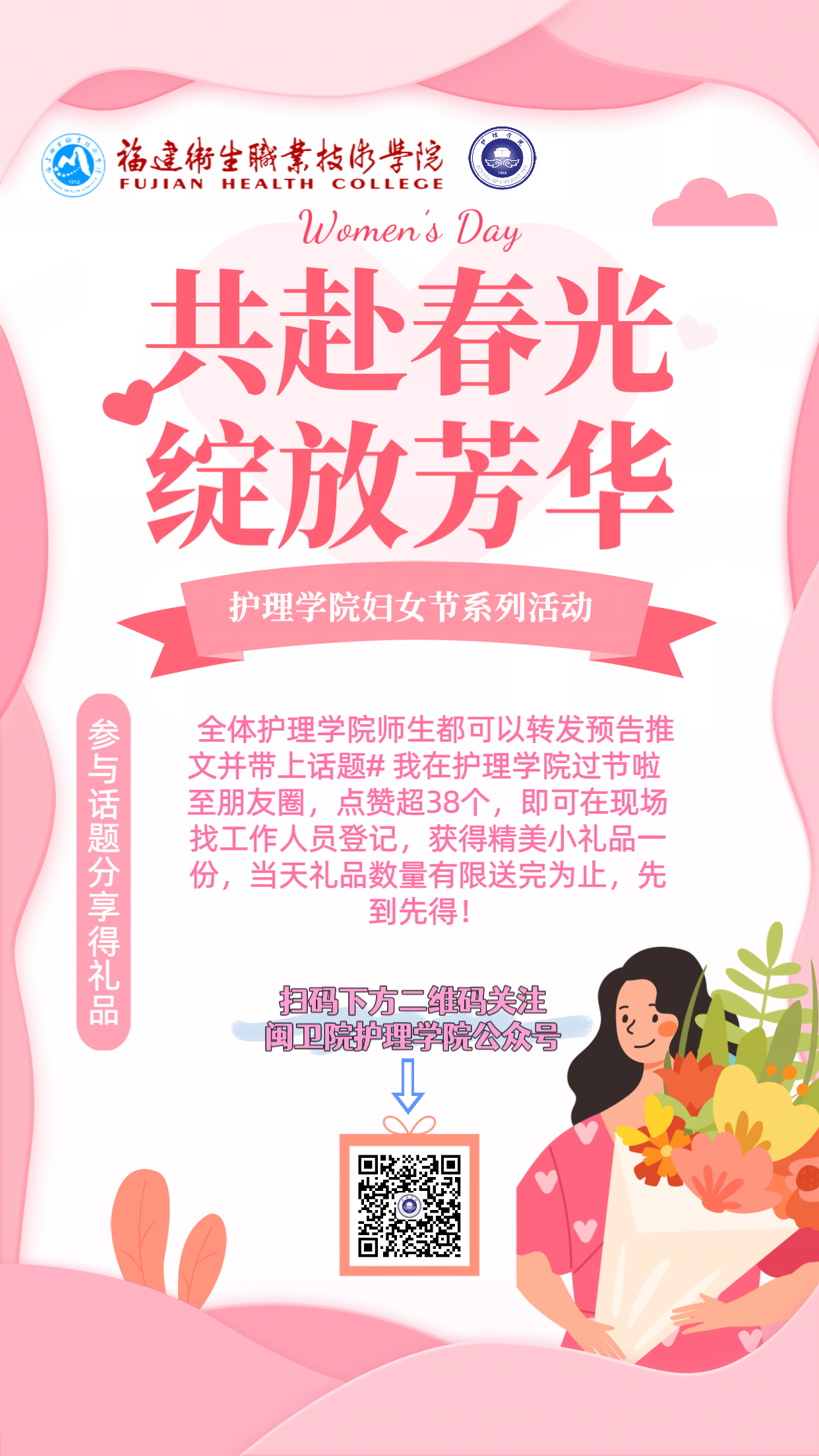 轉(zhuǎn)發(fā)預(yù)告推文并帶上話題#我在護(hù)理學(xué)院過節(jié)啦,點(diǎn)贊超38個(gè),可找工作人員登記,獲得精美小禮品一份(數(shù)量有限送完為止),并會(huì)隨機(jī)抽取2位幸運(yùn)兒,獲得由護(hù)理學(xué)院送出的神秘大禮包!