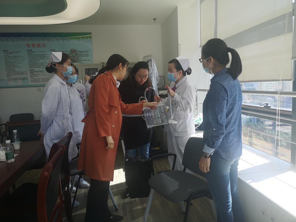 涂秀華老師還熱情地為教研室的老師們分享了她制作的教學視頻——《氣胸病人的胸腔置管術(shù)》、《胸腔閉式引流管的拔管方法》、《肺癌病人的術(shù)前術(shù)后健康宣教》,交流了肺癌患者的微創(chuàng)胸腔鏡手術(shù)治療與護理,還向老師們展示了該科室獲國家專利的多功能輸液架,使老師們更新了知識,拓寬了視野。