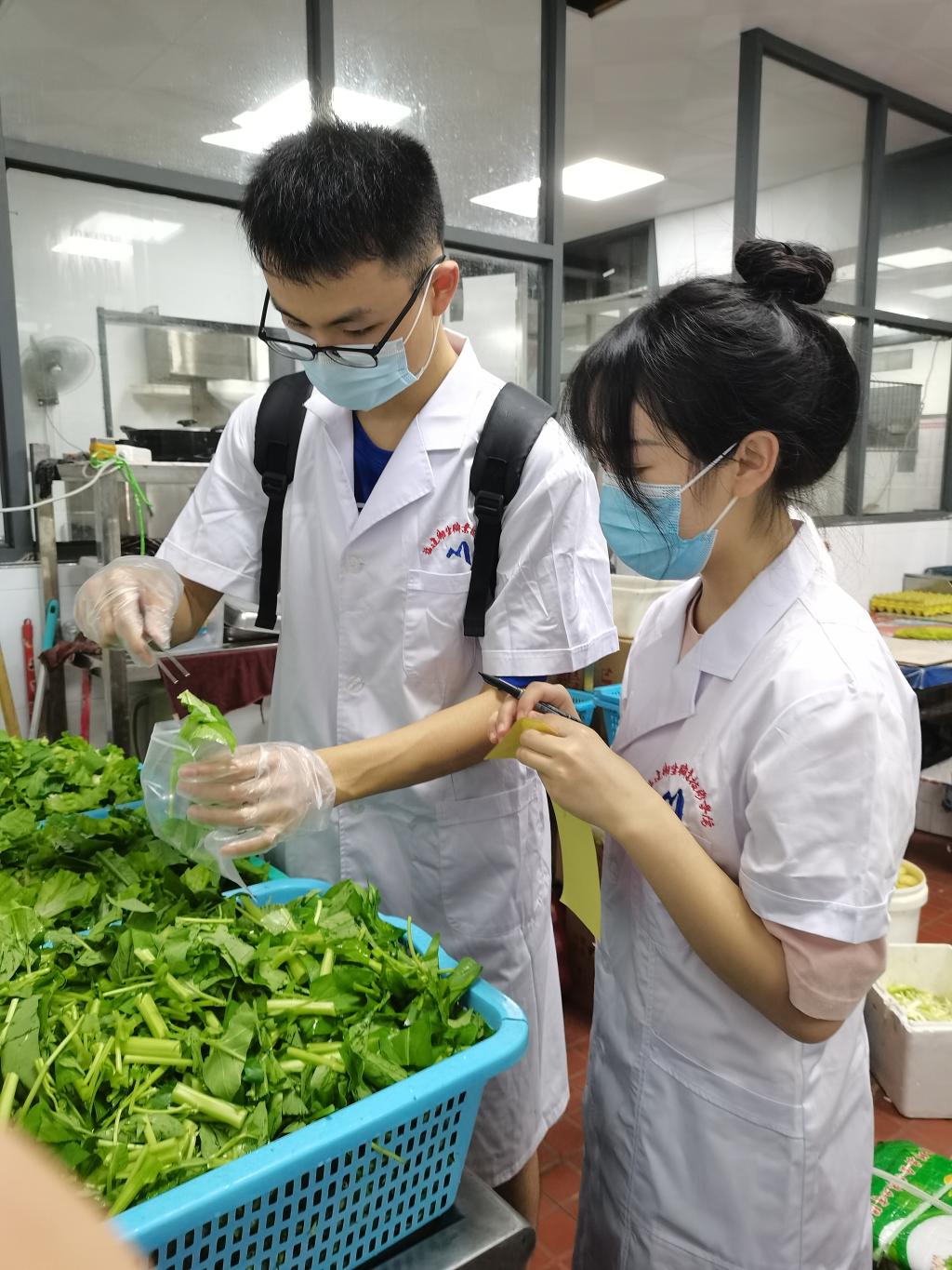 食品質(zhì)量檢測小組隨機抽取各食堂當日切洗浸泡后的蔬菜包括空心菜、黃瓜、花菜、娃娃菜、生菜、上海青等蔬菜,將取樣帶回實驗室開展檢測工作。同行的領導與黨員同志對食堂的食品留樣、健康證、消毒、食品存儲和餐具衛(wèi)生等情況進行重點檢測,現(xiàn)場辦公提出可行的改進措施,并立整即改,全力保障師生的飲食健康與食品安全。