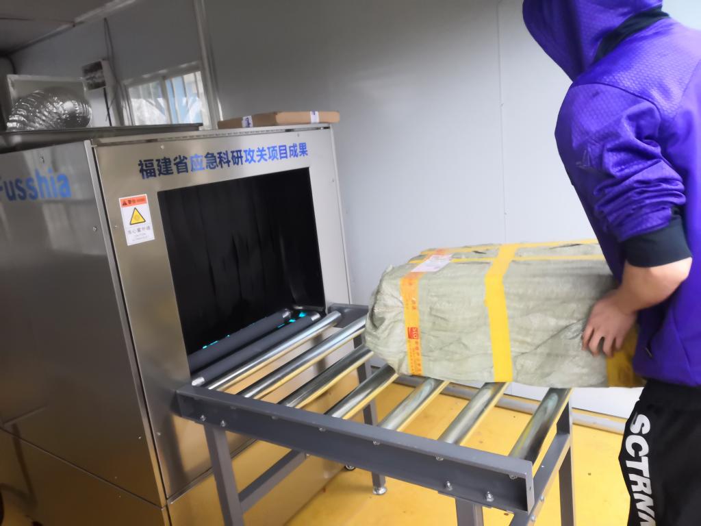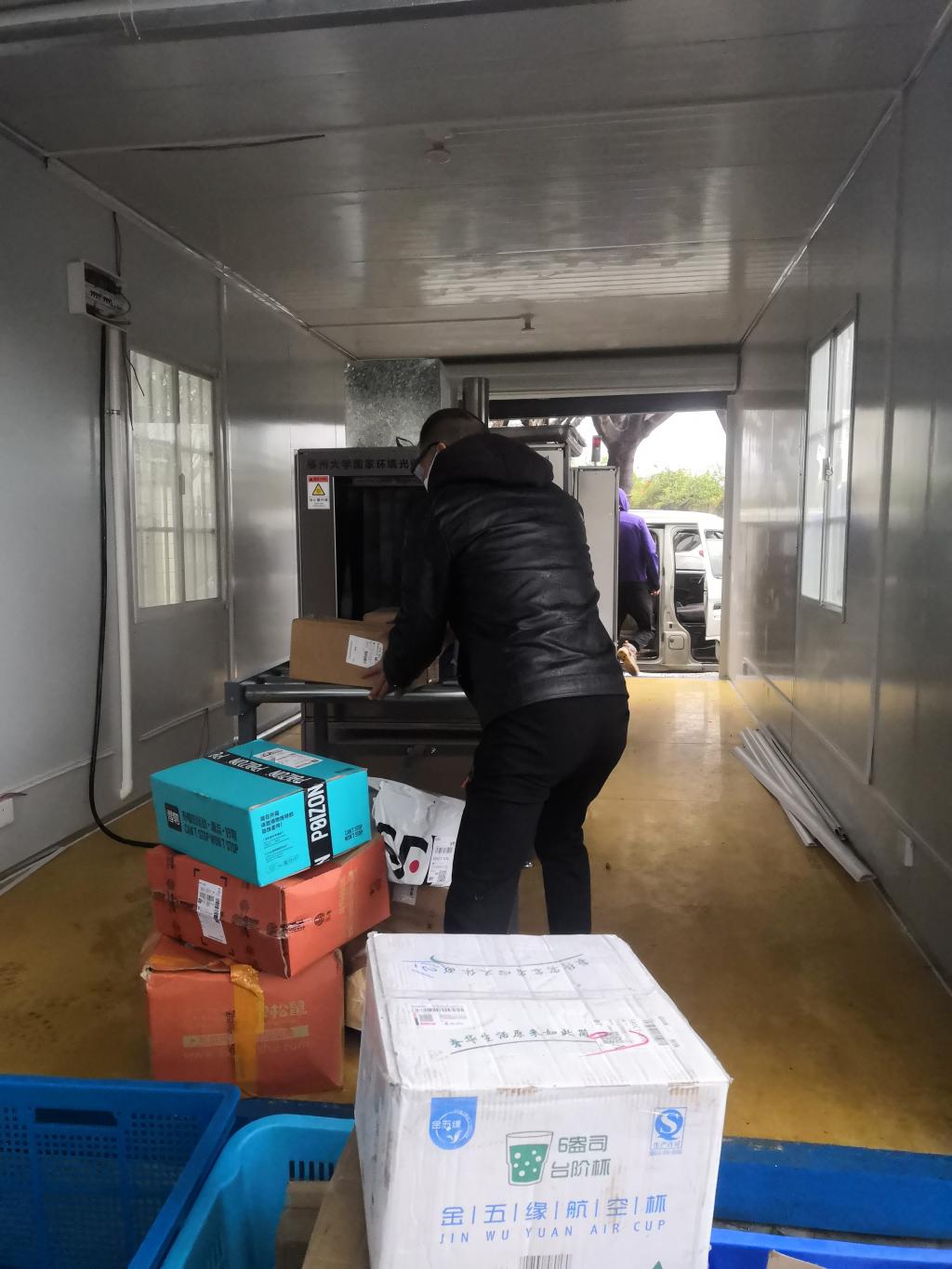該消殺工作站配備的紫外光催化復(fù)合消殺設(shè)備采用消殺能力最強(qiáng)的254nm波長紫外線光源,具有快速高效無污染的消殺特點(diǎn),每小時可消毒2000件貨物。所有進(jìn)校的快遞在校門外中轉(zhuǎn)站進(jìn)行消毒液噴霧消毒后,再轉(zhuǎn)運(yùn)至紫外光催化復(fù)合消殺工作站進(jìn)行二次消毒。冷鏈?zhǔn)称吠ㄟ^紫外光催化復(fù)合消殺后再入庫儲藏。該工作站的啟用,為校園防疫消殺增添了新利器。
