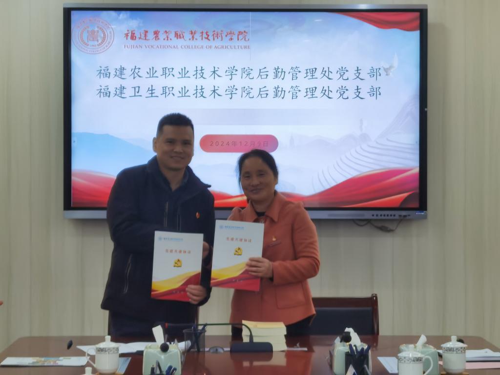 共建儀式上,支部書記王鈍銳與福建農(nóng)業(yè)職業(yè)技術(shù)學(xué)院后勤管理處黨支部書記黃曉梅分別介紹了各自支部的基本情況,雙方圍繞黨組織建設(shè)、黨員發(fā)展、資源共享等進(jìn)行了交流分享,雙方表示將建立常態(tài)化的聯(lián)系溝通機(jī)制,發(fā)揮各自黨組織優(yōu)勢(shì),加強(qiáng)支部建設(shè),探索共建機(jī)制,互相汲取先進(jìn)經(jīng)驗(yàn)和創(chuàng)新做法,堅(jiān)持相互交流學(xué)習(xí),共同提高支部黨建工作水平,提升后勤保障服務(wù)水平。交流結(jié)束后,雙方黨支部書記共同簽署了黨支部共建協(xié)議書。