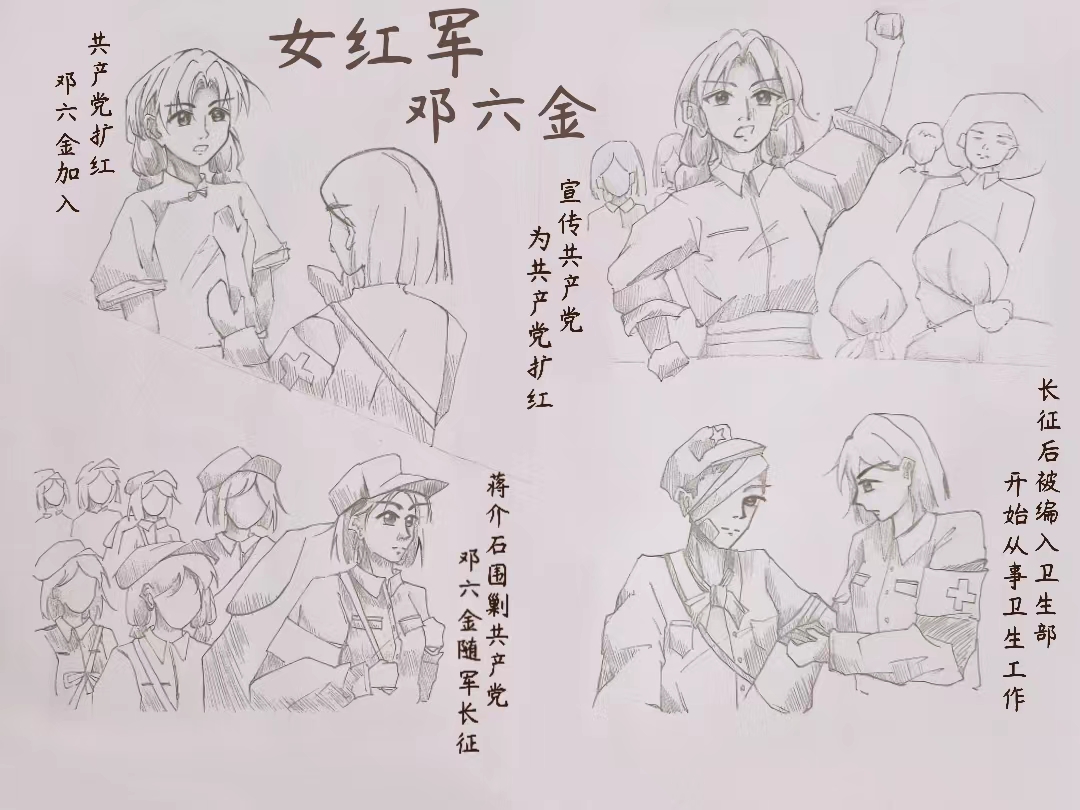 《從閩西蘇區(qū)走出的女紅軍——鄧六金》通過繪畫形式,追憶了從望郎媳到女紅軍、從閩西長征走到陜北的唯一女紅軍鄧六金的一生,特別描繪了長征途中,鄧六金克服缺醫(yī)少藥的困難,以女同志特有的細心和耐心,精心護理傷員,幫助擦洗傷口、換藥、喂飯的生動事跡。繪畫作品《南昌起義軍在汀州福音醫(yī)院》《白求恩在延安》《抗“疫”逆行天使》等一張張畫作,記載著一代代紅醫(yī)為祖國衛(wèi)生健康事業(yè)做出的不可磨滅的貢獻,展示了紅色閩醫(yī)在革命戰(zhàn)爭時期、社會主義現(xiàn)代化建設(shè)時期不畏艱難、救死扶傷的白衣戰(zhàn)士情懷。