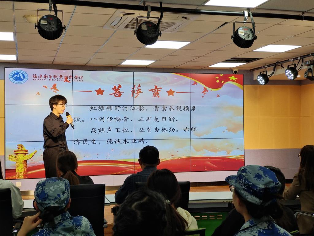“紅旗耀野汀江韻,青囊養(yǎng)銳橘泉飲。八閩傳福音,三軍復(fù)日新。高胡聲玉振,叢育杏林勁。赤膽濟民生,德誠術(shù)業(yè)精?!眮碜蚤}南地區(qū)的學(xué)子用富有壓韻與節(jié)奏之美的閩南話聲情并茂地朗誦原創(chuàng)詩《菩薩蠻》,該詩敘述了“紅色華佗”傅連暲等閩西革命子弟兵的英雄事跡,講述了福音醫(yī)院從閩西遷往江西成立中央紅軍醫(yī)院的崢嶸故事。冒著槍林彈雨救治傷員,醫(yī)治窮苦百姓,這種無畏生死、救死扶傷的精神使同學(xué)們無不動容,不僅展示了對紅醫(yī)前輩的敬仰,更表達了傳承紅醫(yī)精神、在醫(yī)學(xué)探索中砥礪前行的決心。