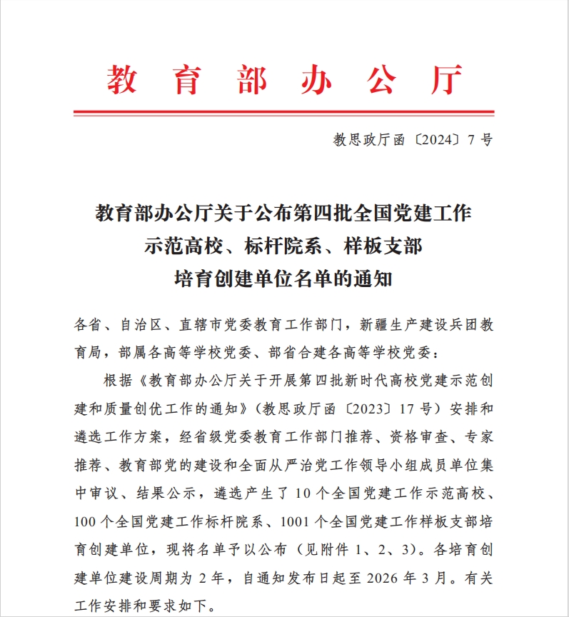 近日,教育部辦公廳公布第四批全國(guó)黨建工作示范高校、標(biāo)桿院系、樣板支部培育創(chuàng)建單位名單,經(jīng)省級(jí)黨委教育工作部門推薦、資格審查、專家推薦、教育部黨的建設(shè)和全面從嚴(yán)治黨工作領(lǐng)導(dǎo)小組成員單位集中審議、結(jié)果公示,遴選產(chǎn)生了10個(gè)全國(guó)黨建工作示范高校、100 個(gè)全國(guó)黨建工作標(biāo)桿院系、1001個(gè)全國(guó)黨建工作樣板支部培育創(chuàng)建單位。