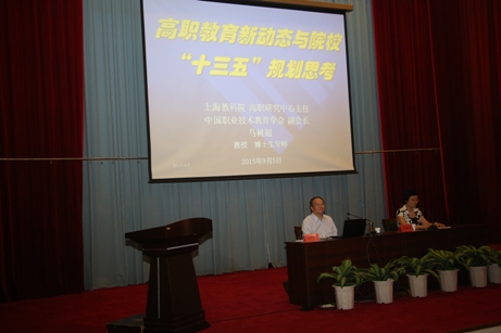 研討會(huì)特別邀請(qǐng)了中國職業(yè)技術(shù)教育學(xué)會(huì)副會(huì)長、高職教育發(fā)展研究中心主任馬樹超教授來校作“高職教育新動(dòng)態(tài)和院?!濉?guī)劃思考”專題講座。馬樹超教授的講座從新常態(tài)思路下高職教育新動(dòng)態(tài)、現(xiàn)代職業(yè)教育新定位、高職發(fā)展環(huán)境特征與改革發(fā)展策略思考等三個(gè)部分展開,在把握“十三五”發(fā)展環(huán)境與階段特征的基礎(chǔ)上確立“十三五”發(fā)展目標(biāo)和總體思路,強(qiáng)調(diào)面對(duì)“互聯(lián)網(wǎng)+”的新常態(tài),高職院校要加快智慧校園和數(shù)字教學(xué)資源建設(shè),完善信息化教學(xué)基礎(chǔ)設(shè)施、深化在線信息技術(shù)環(huán)境下工學(xué)結(jié)合教與學(xué)模式改革。