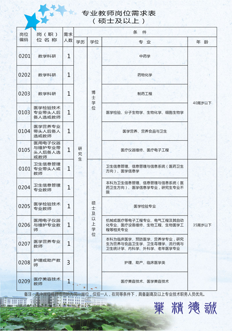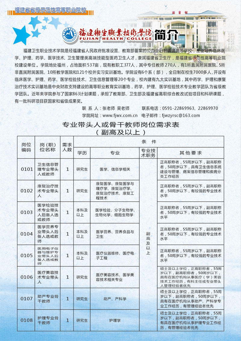 福建衛(wèi)生職業(yè)技術(shù)學(xué)院專業(yè)技術(shù)崗位及高層次人才需求信息表