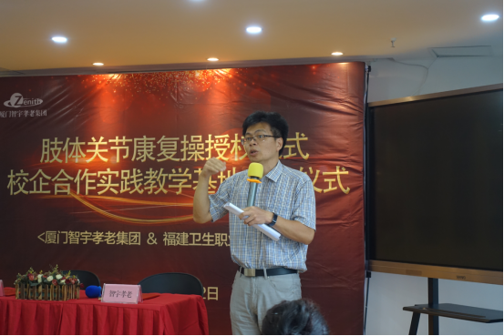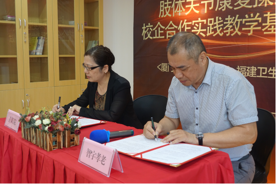 7月2日下午,學(xué)院與廈門智宇孝老集團(tuán)在廈門筼筜街道養(yǎng)老照料中心成功舉行了科技研發(fā)成果“肢體關(guān)節(jié)康復(fù)操”授權(quán)簽約儀式。廈門智宇孝老集團(tuán)劉方曉董事長(zhǎng)、廈門市民政局李龍副局長(zhǎng)、廈門市衛(wèi)健委林剛副局長(zhǎng)、學(xué)院科研處處長(zhǎng)倪峰、臨床醫(yī)學(xué)系主任郭禮堅(jiān)、成果研發(fā)團(tuán)隊(duì)負(fù)責(zé)人陳銘研究員參加儀式。