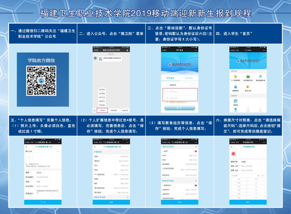 今年我院首次啟用移動迎新,8月份以來迎新系統(tǒng)面向2019級新開放,新生關(guān)注“福建衛(wèi)生職業(yè)技術(shù)學(xué)院”公眾號后,進(jìn)入“移動迎新”頁面,完善個人信息、軍訓(xùn)服裝尺碼選擇、綠色通道(學(xué)費緩交申請)等。新生報到當(dāng)天,出示迎新線上生成的身份二維碼,迎新老師通過學(xué)生二維碼,來確認(rèn)學(xué)生報到情況,便捷了新生報到流程,提高了迎新效率,同時也實現(xiàn)了迎新數(shù)據(jù)的實時可視化。