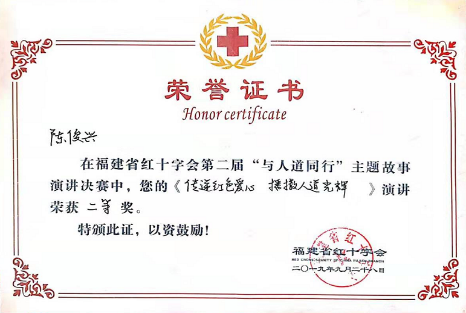 本屆大賽由福建省紅十字會主辦,福建中醫(yī)藥大學(xué)紅十字分會協(xié)辦。大賽以“與人道同行”為演講主題,經(jīng)過一個下午的激烈角逐,最終確定一等獎1名,二等獎2名,三等獎3名。我院17級護理317班陳俊興同學(xué)的“傳遞紅色愛心 播撒人道光輝”主題演講獲得決賽二等獎。