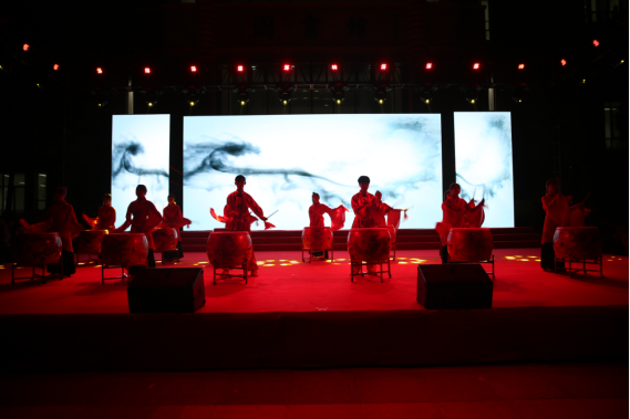 紅衣翩翩,鼓點(diǎn)陣陣,晚會由護(hù)理系、藥學(xué)系選送的水鼓舞表演《龍的傳人》拉開序幕。