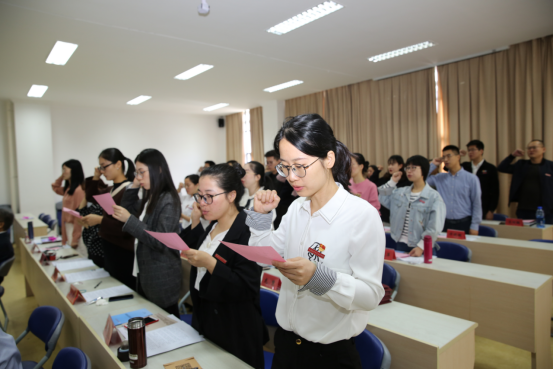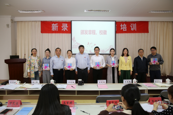 隨后,校領(lǐng)導(dǎo)共同觀看了新同事們精心錄制的自我介紹視頻,為新進(jìn)教職工代表頒發(fā)學(xué)校章程和校徽,并見證了新教師們莊嚴(yán)的入職宣誓。