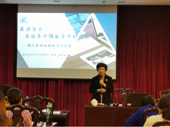 福建醫(yī)科大學(xué)附屬第一醫(yī)院護(hù)理部主任、福建省護(hù)理學(xué)會副理事長林蓉金做了《慕課學(xué)習(xí)在臨床護(hù)理教學(xué)中的應(yīng)用》的講座。她以靜療慕課視頻制作與應(yīng)用為例,從自身長期臨床護(hù)理經(jīng)驗出發(fā),從慕課的特點、慕課學(xué)習(xí)與臨床教學(xué)、慕課課程制作步驟三方面詳細(xì)地分享慕課學(xué)習(xí)在臨床護(hù)理教學(xué)中的應(yīng)用成效,為學(xué)員們回到各自醫(yī)院進(jìn)行護(hù)理教學(xué)基地建設(shè)提供豐富的實戰(zhàn)經(jīng)驗。