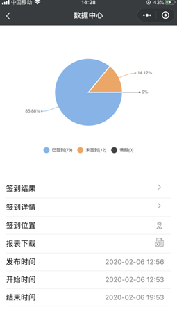 在學院現(xiàn)教中心的大力支持下,學生工作處在對比了多款信息化平臺后,選用微信小程序“我在校園”,開展數(shù)據(jù)信息化報送工作。該平臺目前能精準開展通知發(fā)布、健康問卷調(diào)查、數(shù)據(jù)統(tǒng)計、定位簽到等工作。