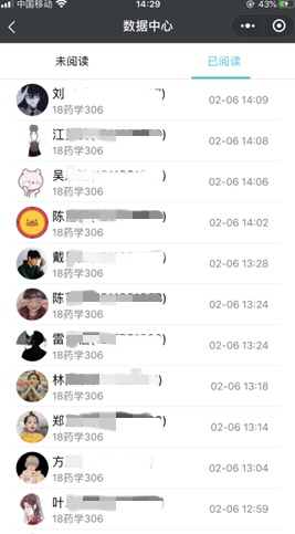 學院的通知一經(jīng)發(fā)布,各輔導員即在班級群予以轉(zhuǎn)發(fā),通過平臺統(tǒng)計,學生管理部門可以即時獲取閱讀情況,可以準確看到班級群里哪些學生已閱讀,哪些學生還未閱讀,閱讀率是多少等信息。