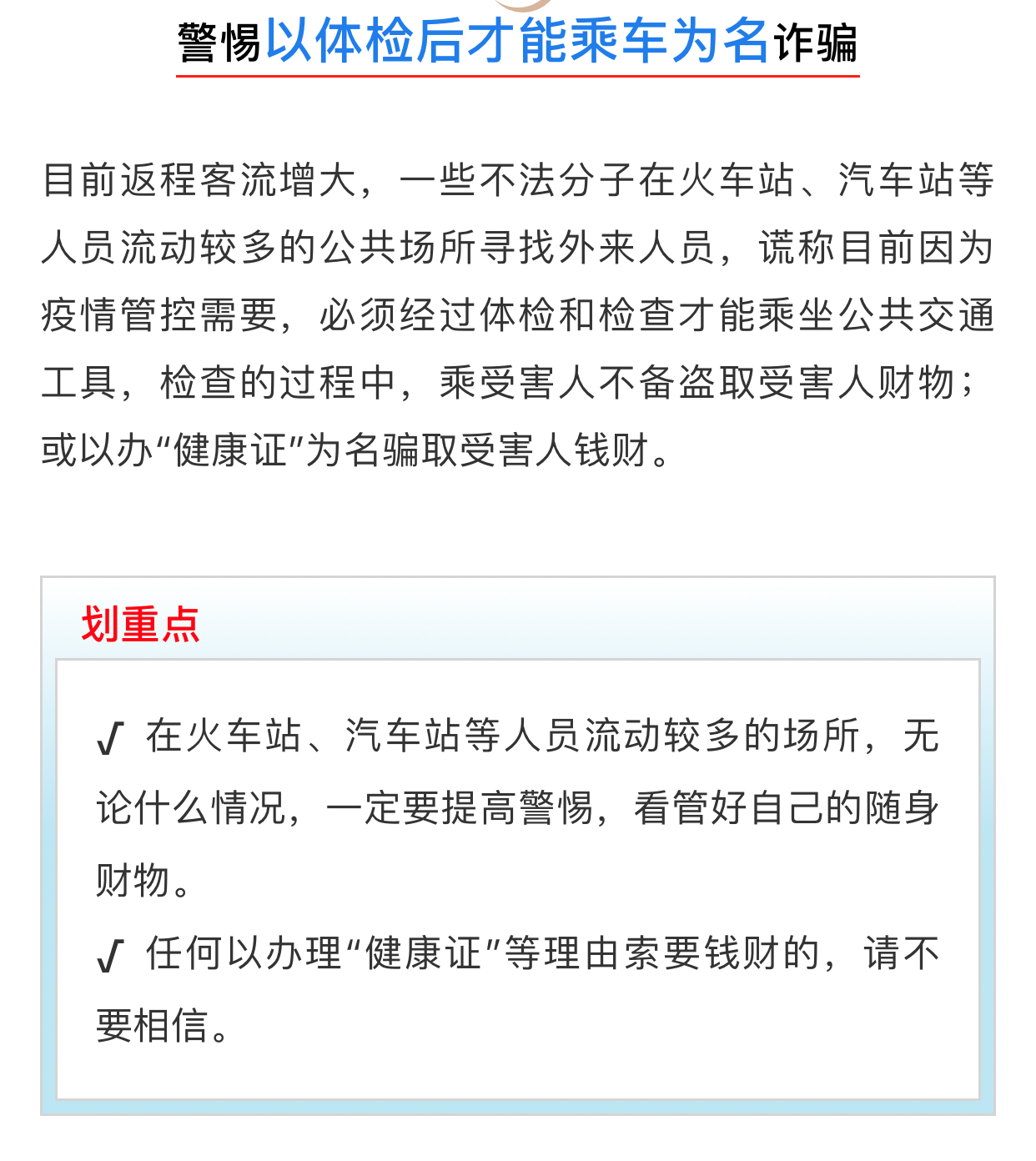 四、以體檢后才能乘車為名詐騙