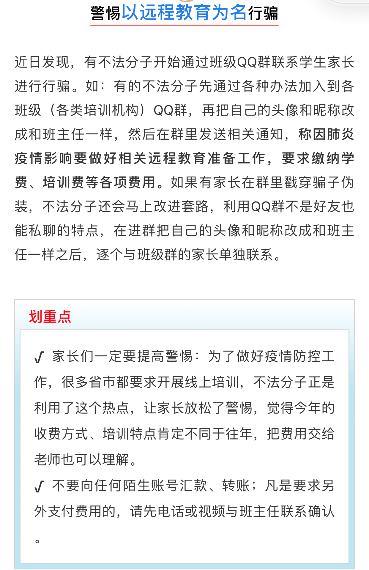 針對以上花樣繁多的騙局,為增強(qiáng)學(xué)生的防范意識,學(xué)工處組織輔導(dǎo)員召開專題防詐騙主題班會(huì),一是轉(zhuǎn)發(fā)教育部網(wǎng)站發(fā)布的《全國治理教育亂收費(fèi)聯(lián)席會(huì)議辦公室關(guān)于謹(jǐn)防有人利用疫情防控期間線上教學(xué)名義進(jìn)行網(wǎng)上收費(fèi)詐騙的預(yù)警(2020年第1號預(yù)警)》到各班級群,落實(shí)學(xué)生查看學(xué)習(xí)。二是提醒學(xué)生謹(jǐn)防各種詐騙手段,強(qiáng)調(diào)現(xiàn)有學(xué)校網(wǎng)絡(luò)課程均為免費(fèi),若遇網(wǎng)絡(luò)信息有疑惑,應(yīng)馬上電話輔導(dǎo)員進(jìn)行確認(rèn),不要盲目相信。三是再次提醒學(xué)生,目前各類騙術(shù)仍在不斷迭代升級,同學(xué)們應(yīng)提高安全防范意識,只要不輕信、不貪心,任何時(shí)候都能遠(yuǎn)離詐騙!