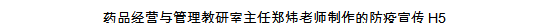 “佩戴口罩固然可以阻斷新冠病毒的飛沫傳播,但卻難以阻斷網(wǎng)絡(luò)“噴子”的飛沫傳播,培養(yǎng)學(xué)生的法律意識(shí),幫助學(xué)生知法、守法,是《醫(yī)藥市場(chǎng)營(yíng)銷》課程思政的切入點(diǎn)之一?!?藥經(jīng)管教研室主任鄭煒老師侃侃而談,她是藥學(xué)系第一黨支部的優(yōu)秀黨員,她積極響應(yīng)支部號(hào)召,組織人手制作了題為“萬眾一心,戰(zhàn)‘疫’有法”的H5,對(duì)疫情防控過程中容易被忽視的違法行為進(jìn)行了宣傳,她主講的在線課程,通過“云班課”的頭腦風(fēng)暴功能,組織學(xué)生分析熱點(diǎn)事件,堅(jiān)定守法意識(shí),受到學(xué)生們的歡迎。