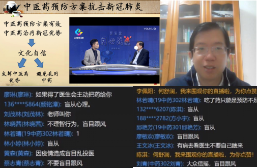 何舒瀾老師主講的《中藥學(xué)》在線課程,從“一夜間‘雙黃連’成為比口罩還緊俏的存在”說起,引發(fā)學(xué)生對(duì)防控疫情期間部分民眾哄搶“雙黃連”這一事件的討論與思考,引申出中藥在疫情防控中如何發(fā)揮作用的問題,教育學(xué)生既要肯定中藥在防控疫情中的重要作用,樹立文化自信并激發(fā)民族自豪感,又要避免陷入亂用中藥的誤區(qū),堅(jiān)持在中醫(yī)理論指導(dǎo)下正確使用中藥。短短十幾分鐘的互動(dòng),不僅圍繞時(shí)政熱點(diǎn)激發(fā)學(xué)生共鳴做到思政教育,同時(shí)也在專業(yè)層面講清了中藥的含義,全程學(xué)生積極參與,踴躍發(fā)言,取得了良好的授課效果。