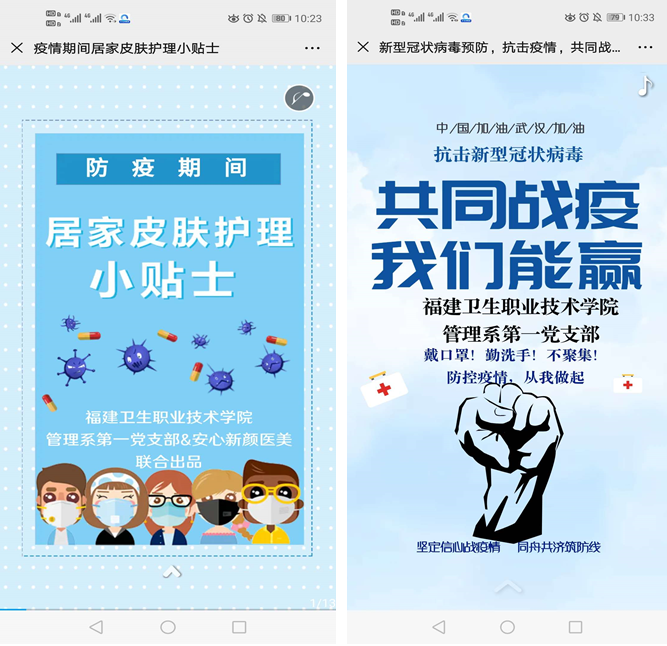 “你在家里戰(zhàn)斗,我為你提供居家隔離生活的‘調(diào)味品’?!惫芾硐档谝稽h支部聯(lián)合預(yù)防醫(yī)學(xué)教研室,在國(guó)家衛(wèi)生健康委員會(huì)和中國(guó)營(yíng)養(yǎng)學(xué)會(huì)編寫(xiě)的“疫情防控期間系列膳食指導(dǎo)”基礎(chǔ)上,根據(jù)同學(xué)們的生活特點(diǎn),整理了飲食中應(yīng)注意的事項(xiàng),制作《平衡膳食、合理營(yíng)養(yǎng),助您抗“疫”》,科學(xué)引導(dǎo)學(xué)生在疫情期間做到合理營(yíng)養(yǎng),增強(qiáng)抵抗力。聯(lián)合醫(yī)學(xué)美容教研室、安心新顏醫(yī)美制作《疫情期間居家皮膚護(hù)理小貼士》H5,“宅家也要美美的,拒絕蓬頭垢面?!?;聯(lián)合健康管理與體育保健教研室制作《科學(xué)鍛煉、強(qiáng)身健體,助您抗“疫”》科學(xué)運(yùn)動(dòng)指南,從運(yùn)動(dòng)項(xiàng)目、運(yùn)動(dòng)強(qiáng)度、運(yùn)動(dòng)時(shí)間、運(yùn)動(dòng)頻率和注意事項(xiàng)等方面進(jìn)行科學(xué)指導(dǎo),引導(dǎo)師生科學(xué)適度的運(yùn)動(dòng)鍛煉提高人體免疫力,有效預(yù)防慢性疾病。