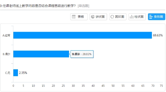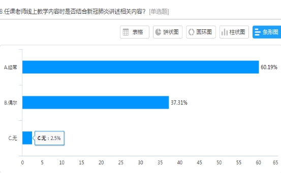 97.5%老師線上教學(xué)內(nèi)容時(shí)會(huì)結(jié)合新冠肺炎講述相關(guān)內(nèi)容,97.65%老師線上教學(xué)內(nèi)容結(jié)合課程思政進(jìn)行教學(xué)。