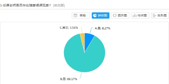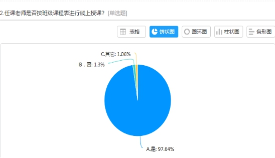 本次問卷共6770名在校學(xué)生參與調(diào)查,教師教學(xué)方面,97.64%的老師按班級課程表進(jìn)行線上授課,88.17%老師不存在隨意調(diào)課現(xiàn)象。