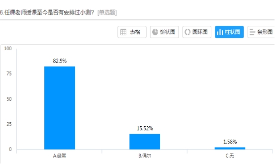 82. 9%老師授課過程中有安排過小測,97.15%老師授課經(jīng)常進(jìn)行考勤。