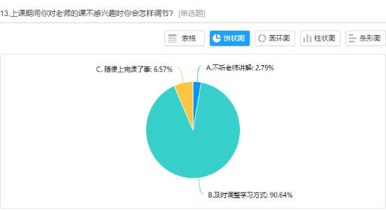與此同時(shí),學(xué)生學(xué)習(xí)方面90.64%學(xué)生上課期間對課程不感興趣時(shí)會(huì)及時(shí)調(diào)整學(xué)習(xí)方式,66.78%學(xué)生課堂上遇到問題時(shí)會(huì)主動(dòng)提問。