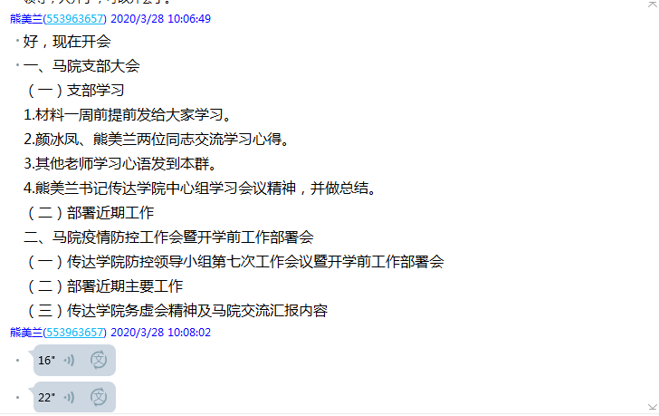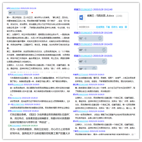 2020年3月28日上午,直屬馬克思主義學院黨支部召開線上黨員大會,集中學習《新時代高等學校思想政治理論課教師隊伍建設規(guī)定》《教育部有關部門負責人就<新時代高等學校思想政治理論課教師隊伍建設規(guī)定>答問》等6份文件。會議由黨支部書記熊美蘭主持,全體教師黨員參加了會議。教師們在會議上暢談心得和感想,掀起學習討論熱潮。