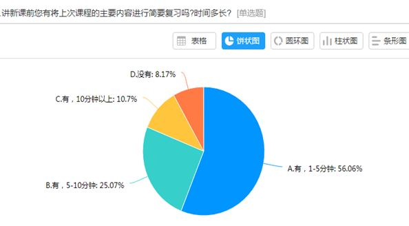此次問(wèn)卷共355位教師參與調(diào)查,其中校內(nèi)教師259位占比72.96%,校外教師96位占比27.04%。教學(xué)方面,91.83%的老師會(huì)在講新課前對(duì)上次課程的主要內(nèi)容進(jìn)行1-10分鐘時(shí)長(zhǎng)不一的簡(jiǎn)要回顧。