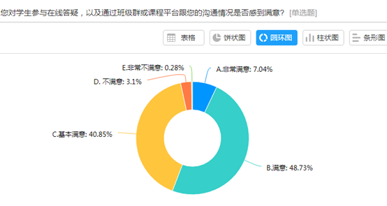 教師對(duì)學(xué)生參與在線答疑,以及通過(guò)班級(jí)群或課程平臺(tái)與老師的溝通滿意率達(dá)96.62%。