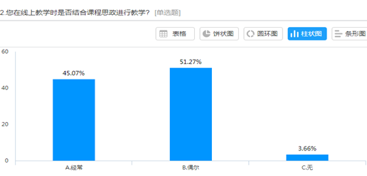 在線授課過(guò)程中老師講課的節(jié)奏也形式多樣,有的依據(jù)時(shí)間和內(nèi)容,有的依據(jù)教材的難易程度,有的依據(jù)學(xué)生的互動(dòng)情況,多講解多演示,較好地完成了在線教學(xué)授課任務(wù)。在線上教學(xué)同時(shí),96.34%的老師還結(jié)合課程思政進(jìn)行教學(xué),全方位育人效果顯著。