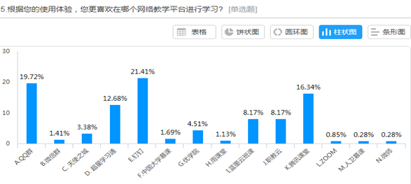 疫情期間,每位老師都是第一次上線當(dāng)主播,面對(duì)新生事物,線上授課無(wú)疑提高了對(duì)教師課堂把控力、信息化技能等多方面的要求。老師們根據(jù)自己的使用體驗(yàn),反復(fù)對(duì)比,選擇出自己更喜歡的網(wǎng)絡(luò)教學(xué)平臺(tái),目前使用較多排名前四的平臺(tái)有:釘釘、QQ群、騰訊課堂、超星學(xué)習(xí)通。此項(xiàng)調(diào)查,也為今后學(xué)院教學(xué)改革發(fā)展提供方向。與此同時(shí),教務(wù)處將調(diào)查統(tǒng)計(jì)結(jié)果反饋各教學(xué)部門,便于老師們及時(shí)調(diào)整教學(xué)策略和調(diào)換教學(xué)平臺(tái)。