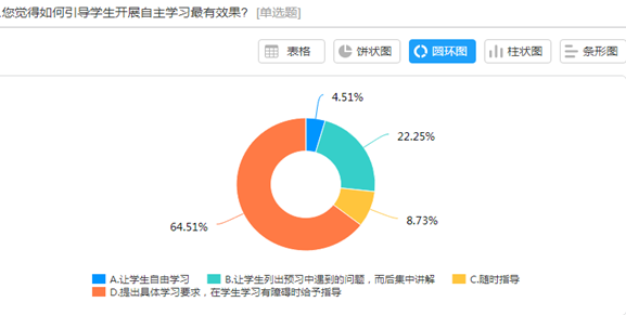 87.89%的學(xué)生會(huì)及時(shí)老師完成所布置的作業(yè)或小測(cè)。60.28%的學(xué)生課堂上會(huì)主動(dòng)積極提問(wèn),上課期間學(xué)生互動(dòng)性降低時(shí),81.97%教師會(huì)及時(shí)調(diào)整教學(xué)方式,扭轉(zhuǎn)學(xué)生注意力。在引導(dǎo)學(xué)生開展自主學(xué)習(xí)方面,當(dāng)學(xué)生遇到問(wèn)題時(shí),更是通過(guò)多種方式解決:有的老師讓學(xué)生列出預(yù)習(xí)中遇到的問(wèn)題,而后集中講解;有的老師提出具體學(xué)習(xí)要求,在學(xué)生學(xué)習(xí)有障礙時(shí)給予指導(dǎo);有的老師隨時(shí)給予指導(dǎo)。