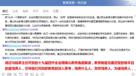 3月3日上午,管理系第一黨支部組織全體黨員在線學(xué)習(xí)馬陸亭主講的題為“學(xué)習(xí)黨的十九屆四中全會精神,推動教育制度的定型完善”的講座,通過學(xué)習(xí)進(jìn)一步引導(dǎo)支部黨員對高職教育進(jìn)行深入思考。以德為先,能力為重,培養(yǎng)德智體美勞全面發(fā)展的人才,為人民服務(wù)。要以此次疫情防控斗爭中廣大醫(yī)務(wù)工作者為榜樣教育學(xué)生,著力培養(yǎng)學(xué)生“珍愛生命、大醫(yī)精誠”的救死扶傷精神,引導(dǎo)學(xué)生將預(yù)防疾病、解除病痛和維護(hù)群眾健康作為自己的神圣職責(zé)。
