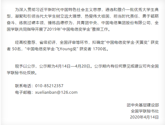 近日,由共青團中央、全國學聯(lián)、中國電信集團股份有限公司共同主辦的2019年度“中國電信獎學金”遴選尋訪活動結(jié)果揭曉。我院學子王虹雨同學榮獲2019年度“中國電信獎學金·飛Young獎”榮譽稱號。