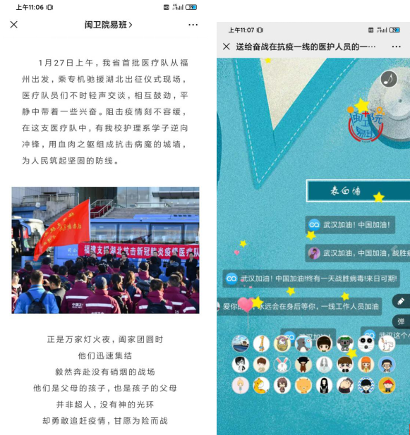 構(gòu)筑思想政治“同心圓”。易班中心及時抓住全國上下抗擊疫情這部實踐教材、這堂實踐大課,開展對大學(xué)生的思想引領(lǐng)。先后轉(zhuǎn)發(fā)《逆行!向著疫情沖鋒的閩衛(wèi)學(xué)子!》和《茍利國家,禍福不避 | 致敬,向疫情沖鋒的閩衛(wèi)人!》兩篇文章,深入挖掘我院校友趕赴疫情一線的典型事跡和感人故事,抒發(fā)抗擊疫情期間難以忘懷的堅守、攜手并進(jìn)的奮戰(zhàn)、守望相助的關(guān)愛和萬眾一心的感動。在2月14日情人節(jié)之際,易班發(fā)起了“一封寫給奮戰(zhàn)在抗疫一線醫(yī)護(hù)人員的特別情書”活動,表白對抗疫一線醫(yī)護(hù)人員的感謝。發(fā)布了《一封寫給奮戰(zhàn)在抗疫前線校友的家書》,用溫暖的文字為校友們送去母校的關(guān)心和問候。