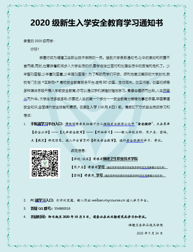 【開(kāi)學(xué)季】2020級(jí)新生入學(xué)安全教育學(xué)習(xí)通知書(shū)