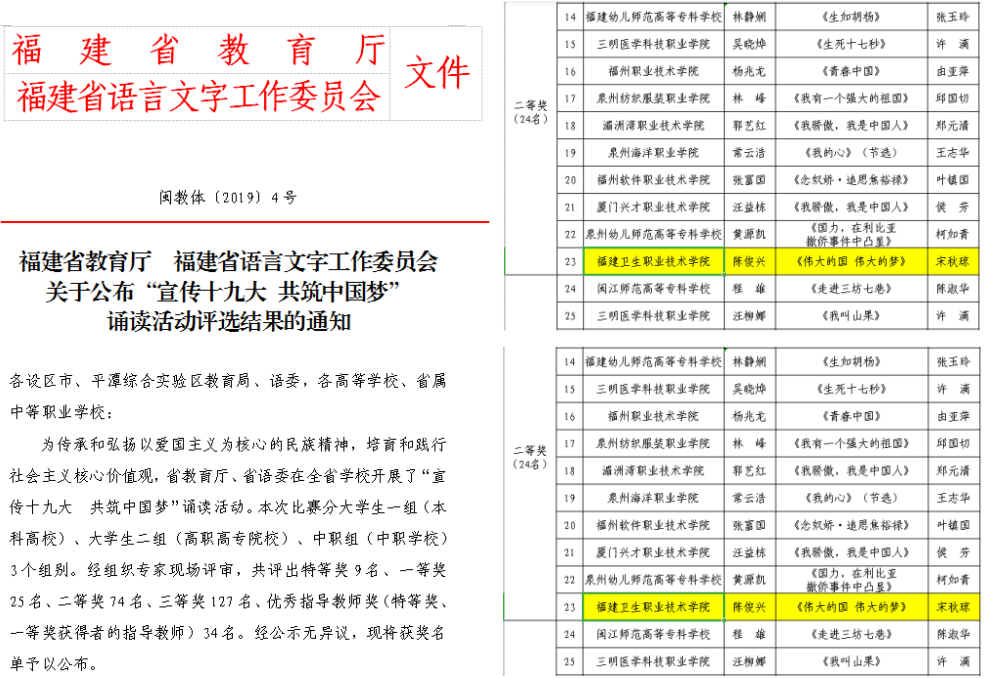 近日,福建省教育廳、福建省語言文字工作委員會(huì)關(guān)于公布“宣傳十九大共筑中國夢(mèng)”誦讀活動(dòng)評(píng)選結(jié)果,我院護(hù)理系陳俊興同學(xué)、臨床醫(yī)學(xué)系史嘉輝同學(xué)分別獲二等獎(jiǎng)、三等獎(jiǎng)。指導(dǎo)老師為宋秋瓊。