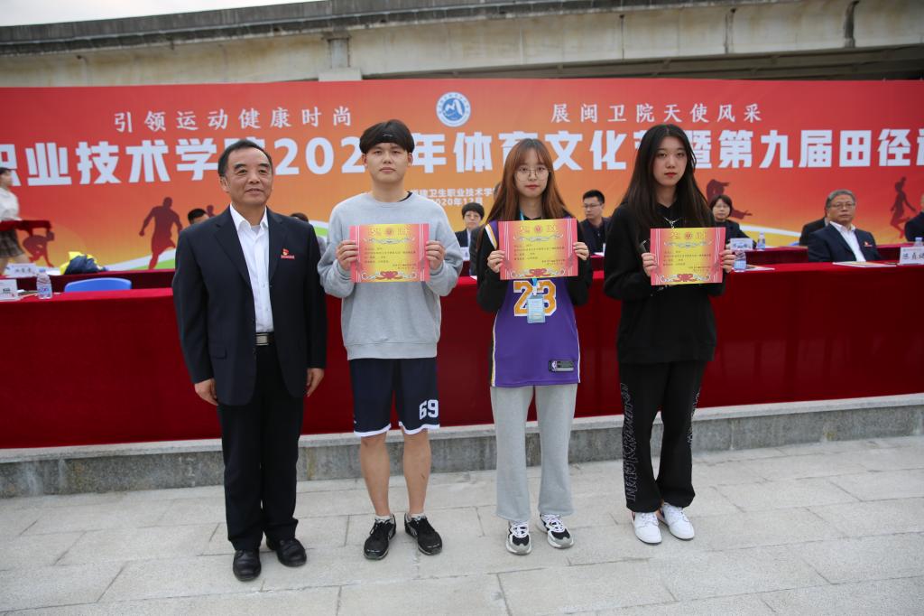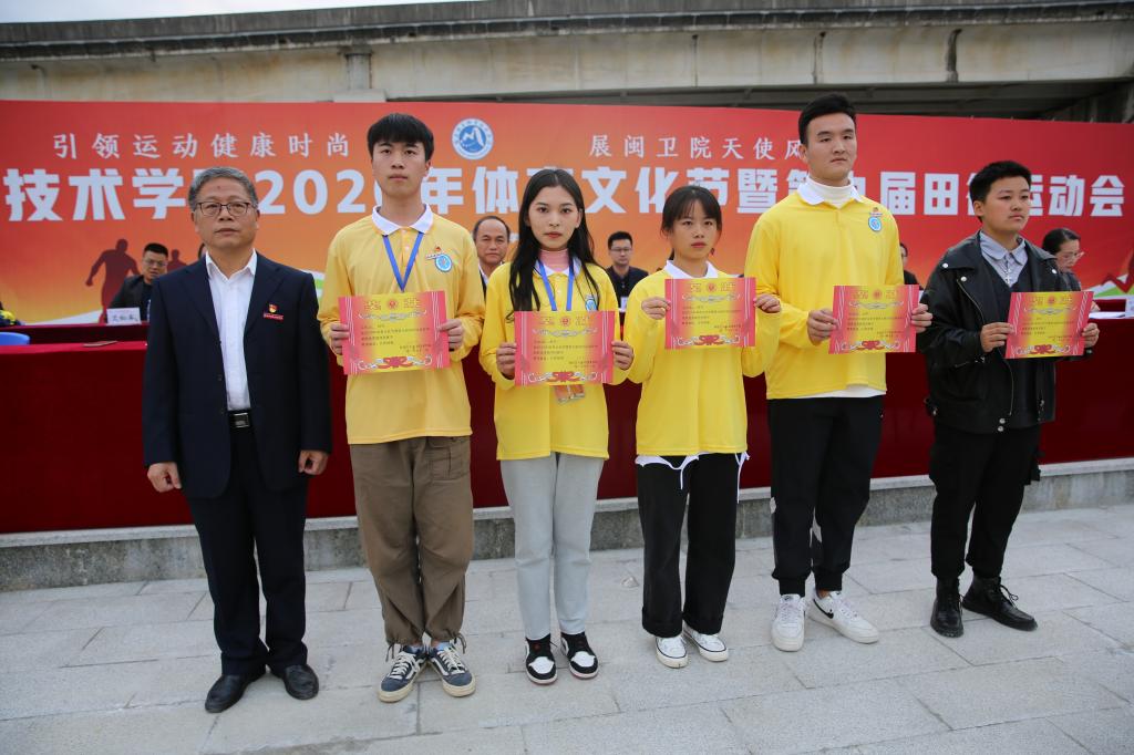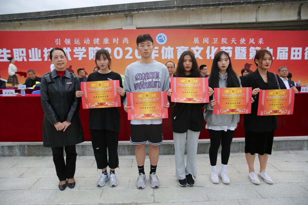 熟悉激昂的《運動員進行曲》中,國旗、校旗護旗隊和各班級代表隊在田徑場就位。陳貞健宣讀學(xué)生優(yōu)秀教練員、裁判員,系部組織獎獲獎及班級體育道德風(fēng)尚獎等名單。鄭翠紅宣讀田徑運動會學(xué)生班級團體總分、班級團體名次,學(xué)生系部團體總分、系部團體名次,學(xué)生組20*200米優(yōu)勝獎,競技跳繩十人8字繞獎,第九套廣播體操獎,田徑運動會教職工團體總分、團體名次,趣味運動項目獎,體育文化節(jié)組織獎和天使風(fēng)采獎等。