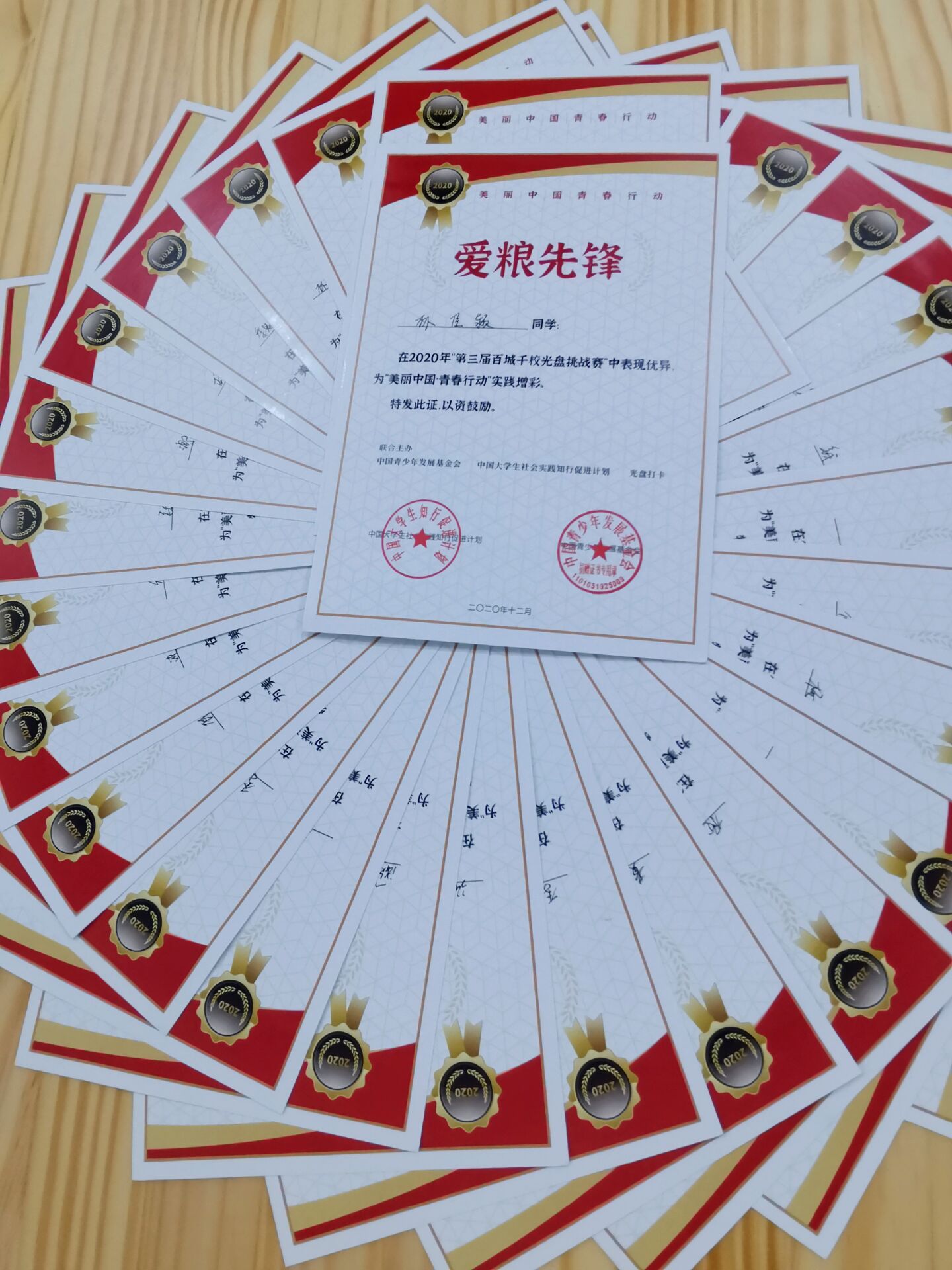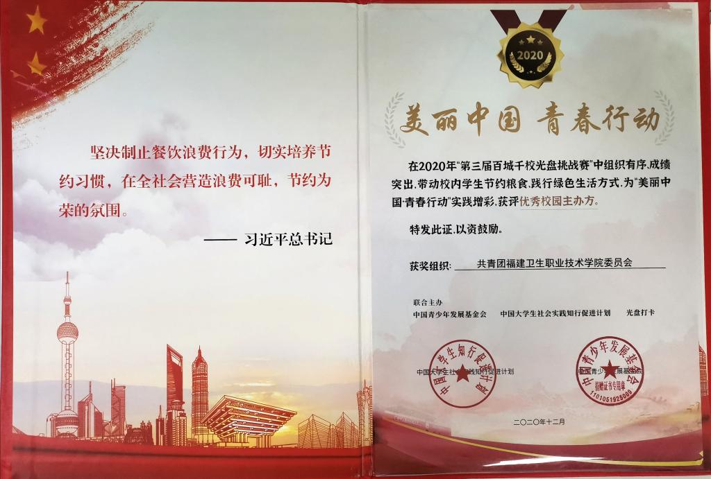 為貫徹落實習近平總書記有關重要指示精神,帶領廣大青年厲行節(jié)儉、弘揚正能量,配合全國青聯(lián)光盤打卡公益工作,堅決制止餐飲浪費行為,切實培養(yǎng)節(jié)約習慣,在全社會營造浪費可恥、節(jié)約為榮的氛圍,我校團委帶動校內(nèi)學生節(jié)約糧食,踐行綠色生活方式,為“美麗中國·青春行動”實踐增彩,我校在此次挑戰(zhàn)賽中榮獲全國第42名,福建賽區(qū)第1名的好成績,并榮獲“優(yōu)秀校園主辦方”榮譽稱號。