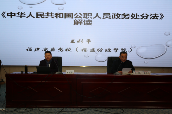 為進一步學(xué)習(xí)貫徹《中華人民共和國公職人員政務(wù)處分法》(以下簡稱《政務(wù)處分法》),加強我校公職人員的政治責(zé)任感和使命感,2021年1月6日下午,我校紀(jì)委特邀福建自貿(mào)試驗區(qū)研究院執(zhí)行院長、福建省委黨校、福建行政學(xué)院法學(xué)院教研部副教授王利平作《政務(wù)處分法》解讀專題講座,校領(lǐng)導(dǎo)、全體中層干部、黨總支(直屬黨支部)書記、黨支部書記、紀(jì)檢委員(含總支、支部紀(jì)檢委員)、紀(jì)委辦公室全體人員等100余人參加。講座由校紀(jì)委書記游鋒主持。