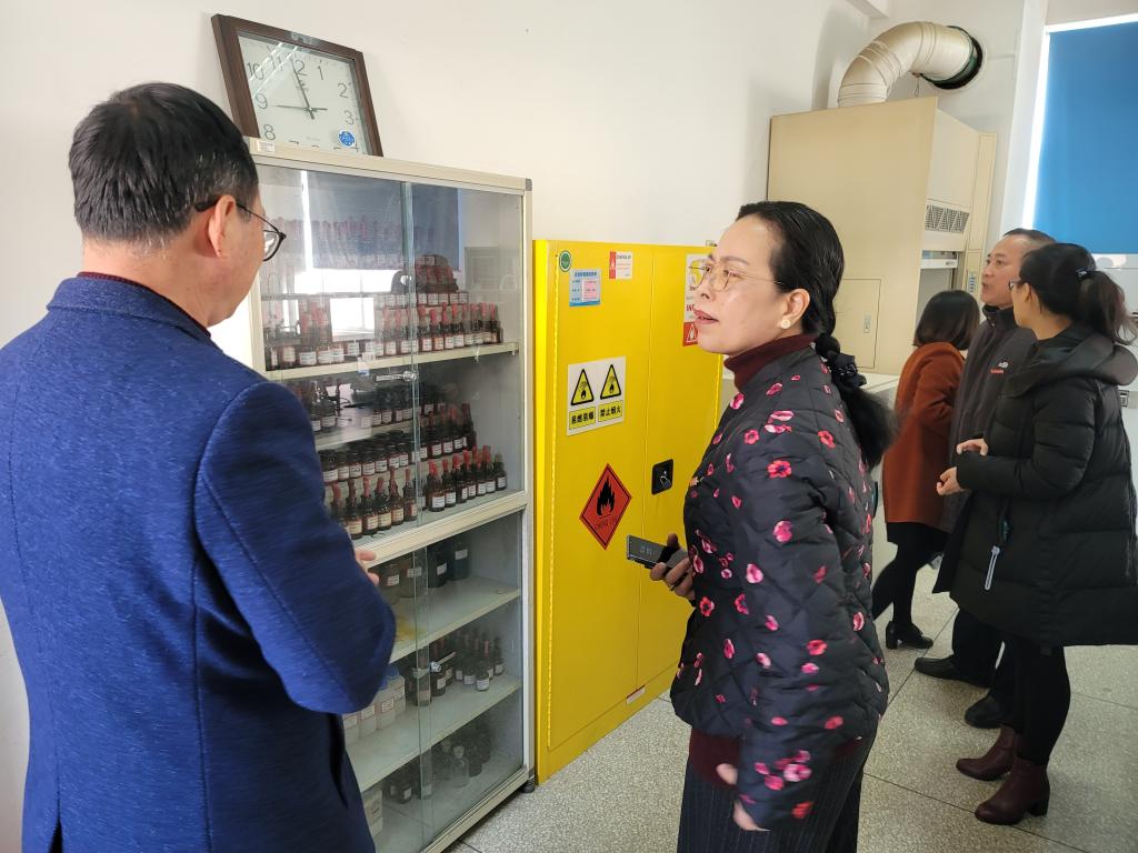 鄭翠紅一行先后實地察看了藥學院、護理學院、醫(yī)學技術(shù)系的教學實訓室。本次檢查的內(nèi)容包括實訓室的設(shè)備運行情況、消防安全、用電安全、通風情況以及環(huán)境衛(wèi)生等有關(guān)安全細節(jié),重點對特殊儀器設(shè)備運行安全、?;芳耙兹家妆穬Υ妗嵱柡牟馁徶霉芾砑皬U液中轉(zhuǎn)回收等情況進行了檢查。