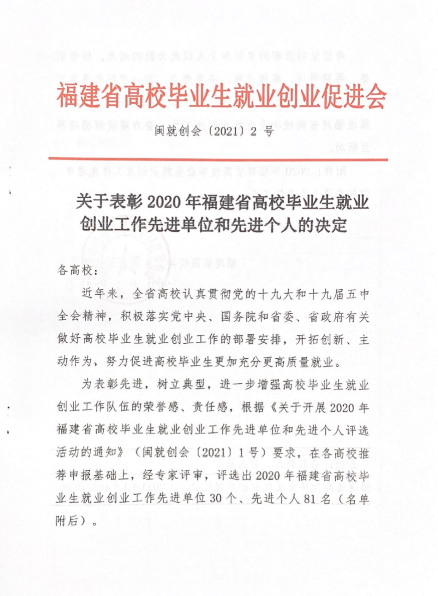 2021年1月15日,福建省教育廳、福建省人社廳聯(lián)合召開(kāi)2021屆高校畢業(yè)生就業(yè)創(chuàng)業(yè)推進(jìn)會(huì)。會(huì)上表彰了2020年我省高校畢業(yè)生就業(yè)創(chuàng)業(yè)工作先進(jìn)單位和先進(jìn)個(gè)人,我校喜獲全省高校畢業(yè)生就業(yè)創(chuàng)業(yè)工作“先進(jìn)單位”榮譽(yù)稱(chēng)號(hào),董東同志喜獲全省高校畢業(yè)生就業(yè)創(chuàng)業(yè)“先進(jìn)個(gè)人”榮譽(yù)稱(chēng)號(hào)。