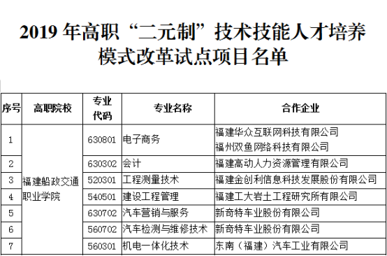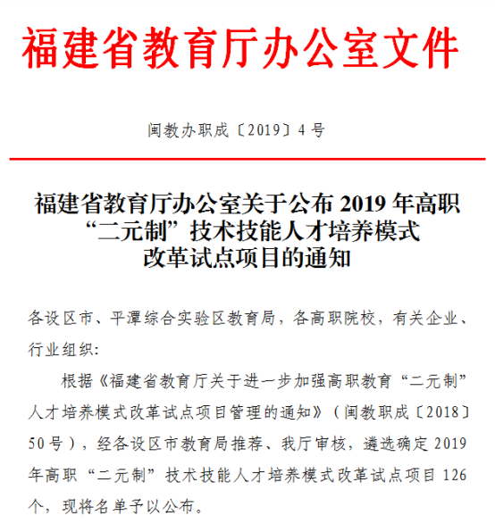 根據(jù)《福建省教育廳關(guān)于進(jìn)一步加強(qiáng)高職教育“二元制”人才培養(yǎng)模式改革試點(diǎn)項(xiàng)目管理的通知》(閩教職成〔2018〕50號(hào)),我院與福建承天金嶺藥業(yè)有限公司合作開(kāi)辦的中藥學(xué)專(zhuān)業(yè)確定為2019年高職“二元制”技術(shù)技能人才培養(yǎng)模式改革試點(diǎn)項(xiàng)目。