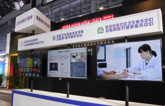 ↑7號館國家衛(wèi)健委展區(qū),福建衛(wèi)生職業(yè)技術(shù)學院的互聯(lián)網(wǎng)+醫(yī)養(yǎng)康護平臺位列其中