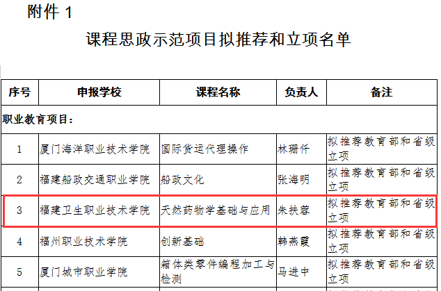 近日,福建省教育廳公布了2021年職業(yè)教育和繼續(xù)教育課程思政示范項目擬推薦和立項名單,我校教務處處長朱扶蓉教授主持申報的《天然藥物學基礎與應用》獲批擬省級立項并推薦教育部參評國家課程思政示范項目、護理學院洪霞教授主持申報的《健康評估》獲批省級立項。這一榮譽體現(xiàn)了我校切實貫徹落實立德樹人根本任務要求,是我校課程思政教學改革工作取得新突破的重要標志,這將帶動我校專業(yè)教師深化課程思政改革,助力構建學?!叭恕毙赂窬帧?/p>