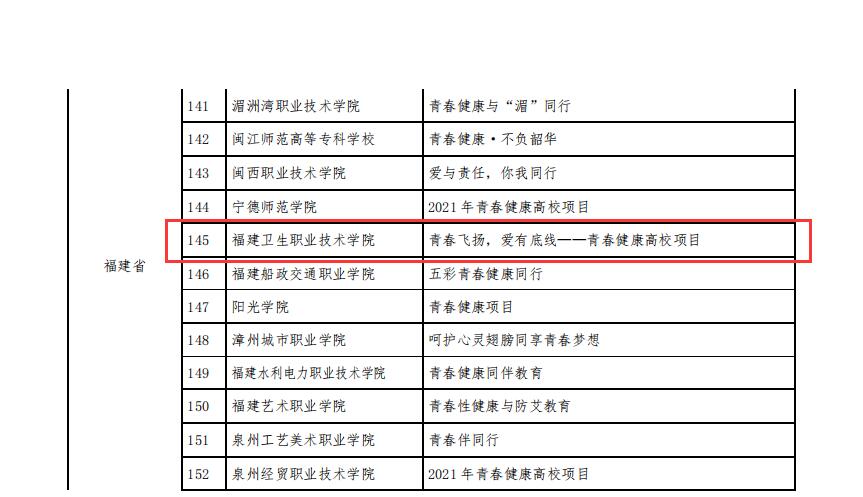 近日,中國計生協(xié)下發(fā)通知,通報2021年青春健康高校項目中標結(jié)果。經(jīng)福建省計生協(xié)會推薦,我?!扒啻猴w揚,愛有底線”項目成功通過評審中標!