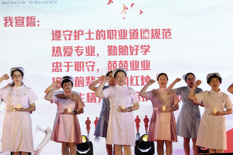 校園中,身著南丁格爾戰(zhàn)地服飾者提著燈緩緩走過,并將手中的燈傳給年輕一輩。她們共同在南丁格爾雕塑下重溫誓言:我是護(hù)士,我宣誓:遵守護(hù)士的職業(yè)道德規(guī)范;熱愛專業(yè),勤勉好學(xué),忠于職守,兢兢業(yè)業(yè),接過前輩手中的紅燭,將畢生精力奉獻(xiàn)給護(hù)理事業(yè)。